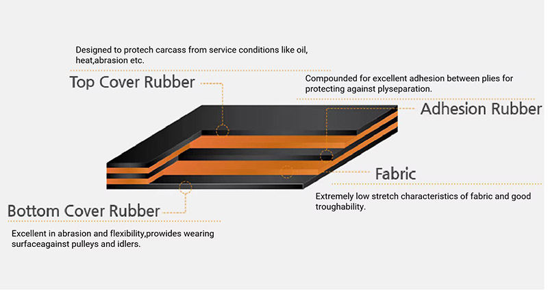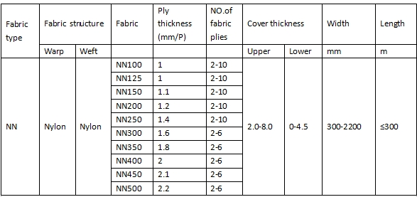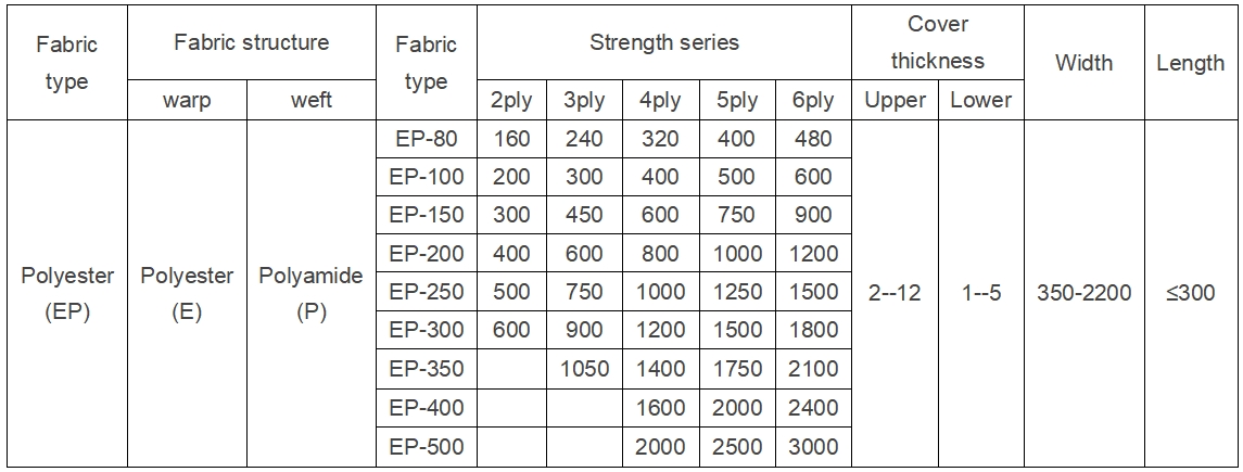 With the advantages of thin belt with light weight, high tensile strength, fatigue and wear resistance, erosion resistance of water/steam/chemical, good impact resistance, excellent groove formation ability, low elongation, good stability ever heated and long service life, it’s the developing trend of fabric conveyor belt. It is mainly used in harsh condition of long distance, heavy-load, high-chemical corrosive etc, it is especially suitable for transporting in moist environment.
