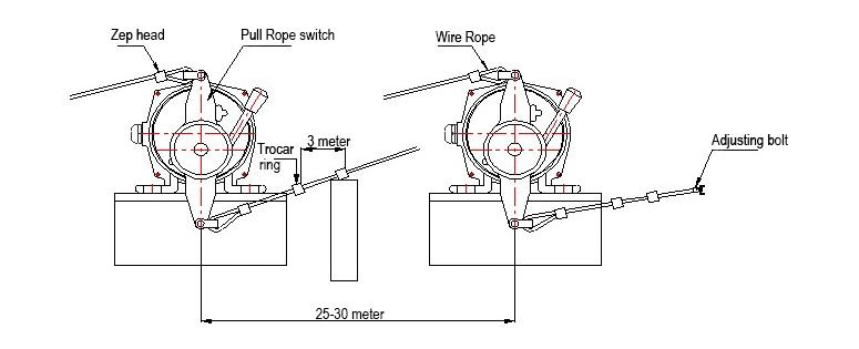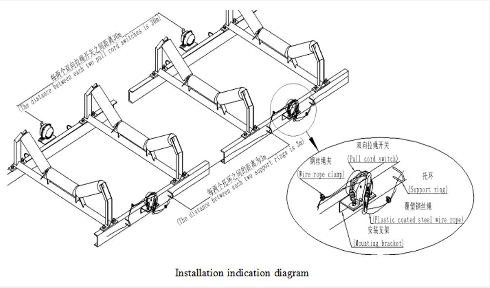 The switch is balanced on the fixed bracket of the frame; Tie the wire rope to the pull ring at the upper and lower ends of the pull rope switch, with the wire rope not exceeding 40 meters on each side (should be shortened to 25 meters when there is a slope). The pull rope pressure should be appropriate to ensure reliable reset of the switch. setting the pull rope along the parallel direction of the tape, adding a lifting ring every 3 meters.